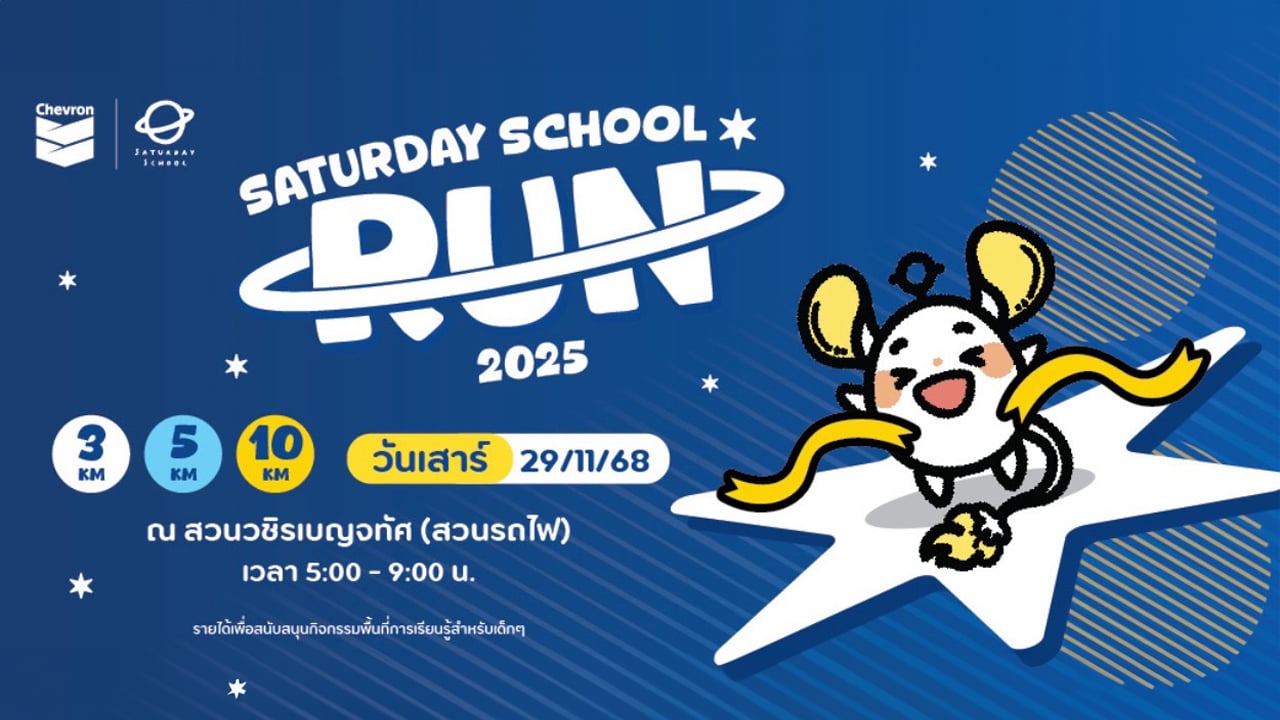 บริษัท เชฟรอนประเทศไทยสำรวจและผลิต จำกัด ร่วมกับ มูลนิธิโรงเรียนวันเสาร์ (Saturday School Foundation) ขอเชิญชวนเข้าร่วมกิจกรรมวิ่งการกุศล “Saturday School Run 2025: วิ่งด้วยกันเพื่อฝันน้อง” เพื่อระดมทุน และนำรายได้ทั้งหมดโดยไม่หักค่าใช้จ่าย ไปใช้สนับสนุนภารกิจของมูลนิธิโรงเรียนวันเสาร์ หรือ Saturday School Foundation ในการจัดกิจกรรมที่มุ่งเน้นการพัฒนาทักษะและส่งเสริมการเรียนรู้นอกห้องเรียนให้กับเยาวชนทั่วประเทศ โดยงานวิ่งการกุศลนี้จะจัดขึ้นในวันเสาร์ที่ 29 พฤศจิกายน 2568 เวลา 5.00 – 9.00 น. ณ สวนวชิรเบญจทัศ (สวนรถไฟ)