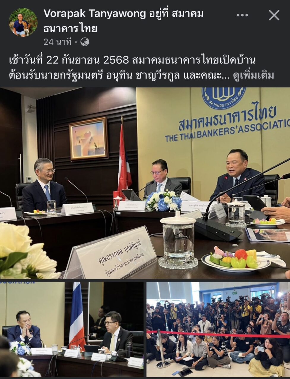 นายวรภัค ธันยาวงษ์ รมช.คลัง ได้โพสต์ลงเฟซบุ๊กส่วนตัว ระบุว่า เช้าวันที่ 22 กันยายน 2568 สมาคมธนาคารไทยเปิดบ้านต้อนรับนายกรัฐมนตรี อนุทิน ชาญวีรกูล และคณะ ครม. เศรษฐกิจ ซึ่งเป็นครั้งแรกในรอบ 58 ปีที่มีนายกรัฐมนตรีมาเยือนสมาคมธนาคารไทย