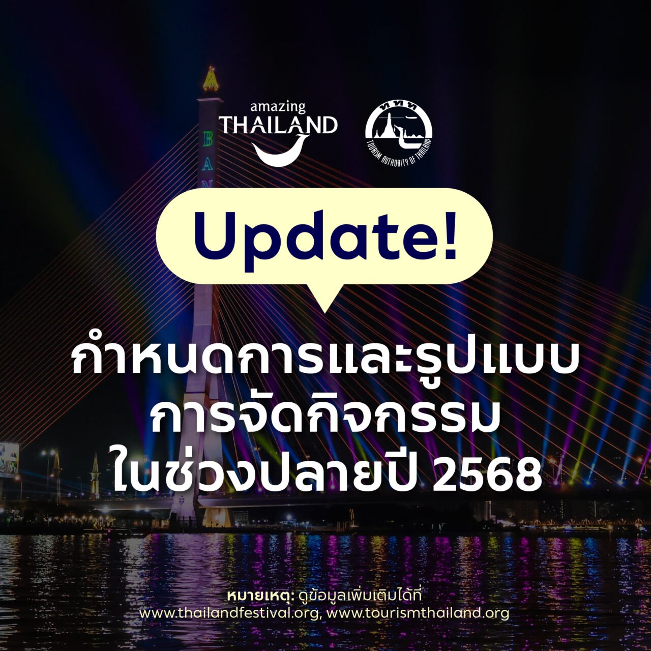 ตามที่ได้มีประกาศสำนักพระราชวัง เรื่อง สมเด็จพระนางเจ้าสิริกิติ์ พระบรมราชินีนาถ พระบรมราชชนนี พันปีหลวง สวรรคต ลงวันที่ 24 ตุลาคม 2568 นั้น ททท. ได้พิจารณาแนวทางการจัดกิจกรรมในช่วงเดือนตุลาคม -พฤศจิกายน 2568 โดยแบ่งเป็น 3 แนวทางหลัก ได้แก่ การเลื่อนกำหนดการจัดงาน การปรับรูปแบบการจัดกิจกรรม และการยกเลิกบางกิจกรรม โดยทดแทนด้วยกิจกรรมทางศาสนาและวัฒนธรรมอื่น ๆ เพื่อแสดงออกถึงความเคารพและสำนึกในพระมหากรุณาธิคุณ โดยมีรายละเอียดดังนี้