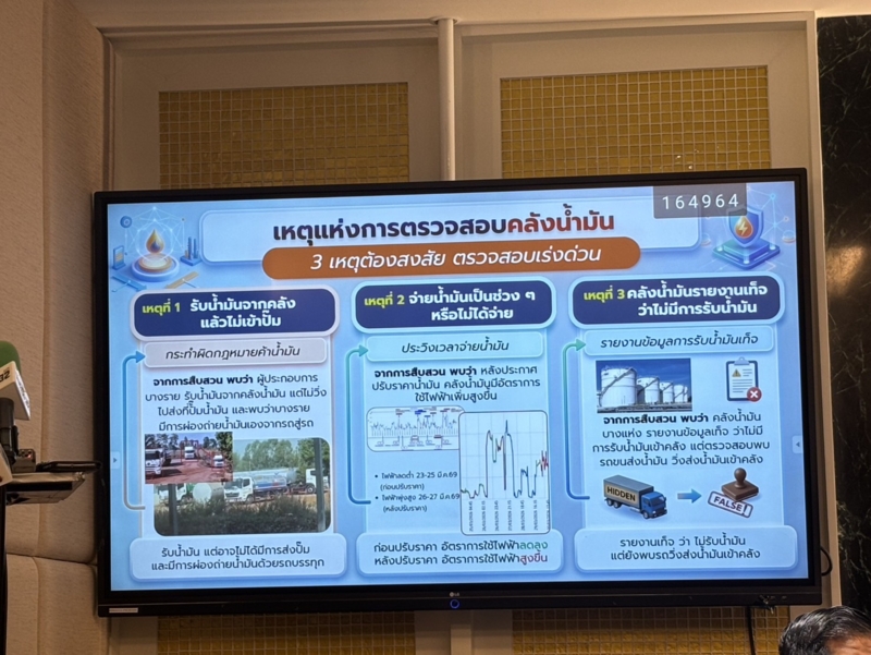 นอกจากนี้ ยังมีวันที่ 15-17 มี.ค.2569 ที่ไม่มีการจ่ายกำลังไฟ แต่พบความผิดปกติ ช่วงวันที่ 20-25 มี.ค.2569 ก่อนที่จะเกิดเหตุการณ์น้ำมันราคาขึ้น พบว่าวันที่ 26 มี.ค.2569 มีการอัดกระแสไฟฟ้าจ่ายน้ำมันจากคลัง สูงถึง 1,600 กิโลวัตต์ แต่เมื่อไปดูน้ำมันคงคลัง วันที่ 20-25 มี.ค.2569 มีคงคลังประมาณ 20 ล้านลิตร โดยจะดูการจ่ายกระแสไฟฟ้าของแต่ละคลัง ทั้งหมด 92 คลัง