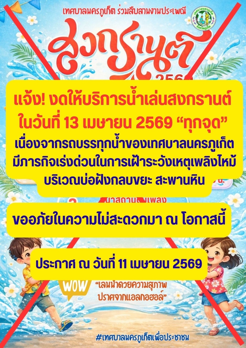 เทศบาลนครภูเก็ต ประกาศงดให้บริการรถน้ำ ในเทศกาลสงกรานต์ หลังเกิดเหตุไฟไหม้บ่อขยะสะพานหินรุนแรง เมื่อช่วงค่ำที่ผ่านมา จนต้องระดมรถน้ำจากหลายพื้นที่มาช่วยสกัดไฟไม่ให้ลุกลามวันนี้ (12 เม.ย.2569) เทศบาลนครภูเก็ต ประกาศแจ้งงดให้บริการน้ำเล่นสงกรานต์ 2569 ในวันที่ 13 เม.ย.2569 ทุกจุดบริการ เนื่องจากรถบรรทุกน้ำของเทศบาลนครภูเก็ต มีภารกิจเร่งด่วน ในการเฝ้าระวังเหตุเพลิงไหม้ บริเวณบ่อขยะสะพานหิน
