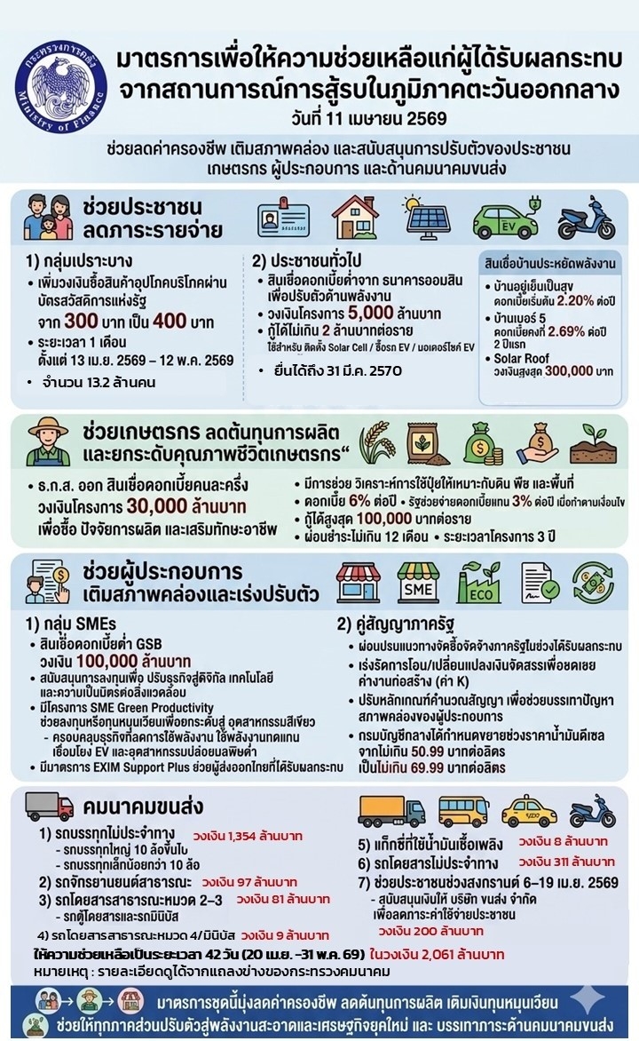 ‘คลัง’ จัดชุดใหญ่ คลอดมาตรการให้ความช่วยเหลือประชาชนและผู้ประกอบการ ภาคขนส่ง เกษตรกร เพื่อบรรเทาผลกระทบจากสถานการณ์การสู้รบในภูมิภาคตะวันออกกลางวันนี้ (11 เม.ย.2569) นายเอกนิติ นิติทัณฑ์ประภาศ รองนายกรัฐมนตรี และรมว.คลัง กล่าวว่า คณะรัฐมนตรีมีมติเห็นชอบมาตรการให้ความช่วยเหลือ แก่ผู้ที่ได้รับผลกระทบจากสถานการณ์การสู้รบในภูมิภาคตะวันออกกลาง เพื่อเป็นการบรรเทาผลกระทบ และป้องกันความเสี่ยงทางเศรษฐกิจจากสถานการณ์ดังกล่าว ที่อาจส่งผลให้เกิดภาวะเศรษฐกิจชะลอตัวควบคู่กับอัตราเงินเฟ้อที่พุ่งสูงขึ้น (Stagflation) ซึ่งจะส่งผลกระทบต่อทุกภาคส่วน