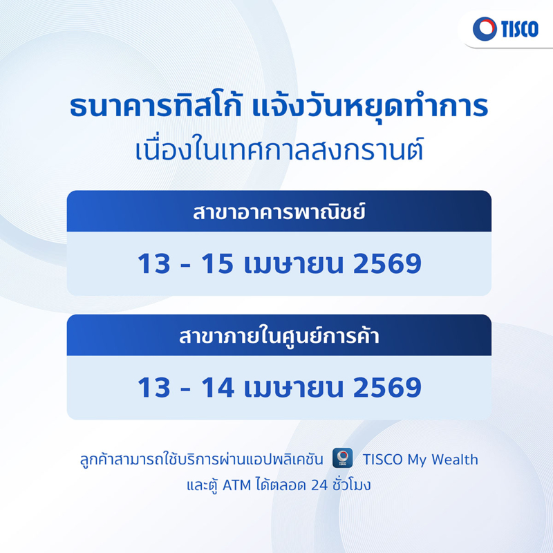 • สาขาทั่วไป ปิดทำการในวันที่ 12-15 เมษายน 2569 และ เปิดทำการ วันที่ 16 เม.ย. 69