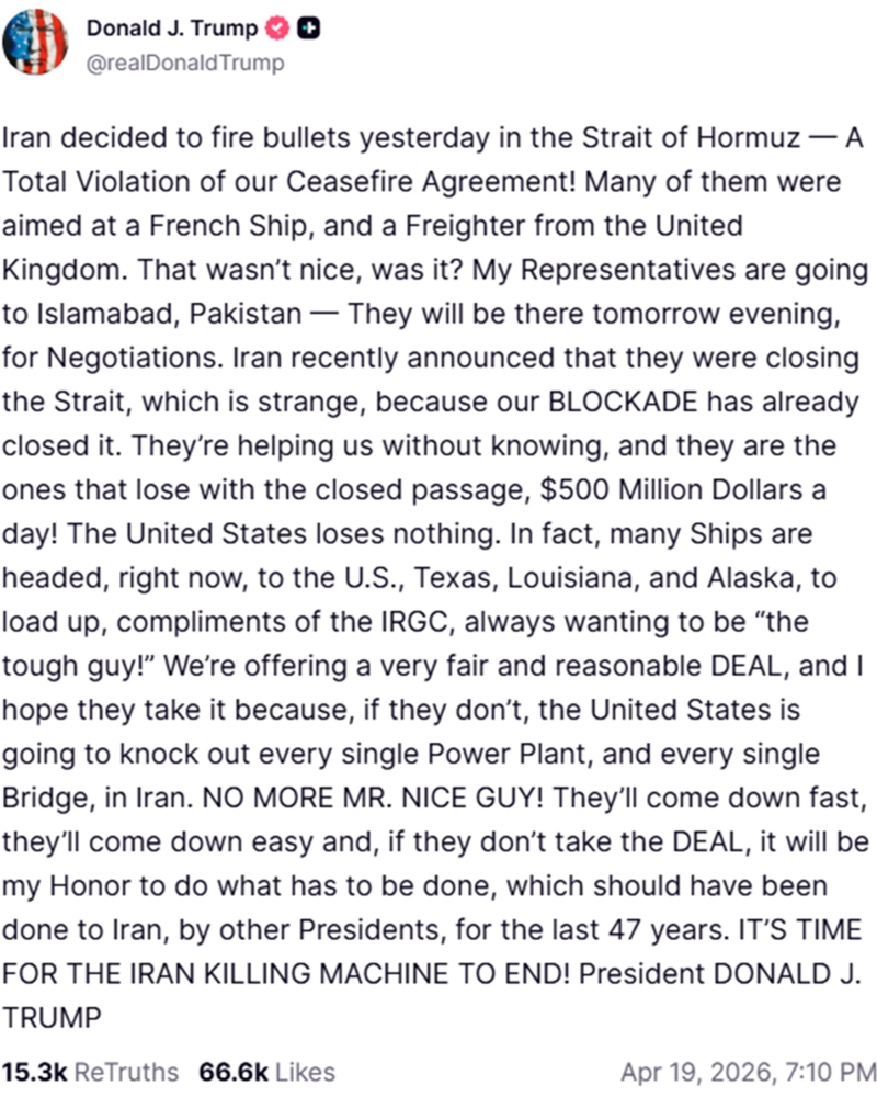 กองทัพเรือสหรัฐฯ ยิงเรือสินค้าอิหร่านกลางน่านน้ำสากล ท่ามกลางบรรยากาศการทูตที่ล้มเหลว เมื่อ "ทรัมป์" ยื่นคำขาดขู่ทำลายโครงสร้างพื้นฐานอิหร่านหากปฏิเสธข้อเสนอสันติภาพ เตหะรานโต้กลับ "เงื่อนไขเพ้อฝัน" ส่อแววเจรจารอบ 2 ล่มวันนี้ (20 เม.ย.2569) วิกฤตการณ์ในตะวันออกกลางที่ดำเนินต่อเนื่องมานานกว่า 50 วัน กำลังก้าวเข้าสู่ภาวะสุ่มเสี่ยงต่อการเกิดสงครามเต็มรูปแบบอีกครั้ง เมื่อ ปธน.โดนัลด์ ทรัมป์ แห่งสหรัฐฯ ได้ประกาศผ่านแพลตฟอร์มทรูธโซเชียล ถึงความสำเร็จของกองทัพเรือสหรัฐฯ ในการเข้ายึดเรือสินค้า "TOUSKA" ติดธงอิหร่าน บริเวณอ่าวโอมาน