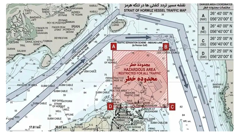 แผนที่การแยกช่องทางการจราจรในช่องแคบฮอร์มุซ จาก IRGC ลงวันที่ 9 เม.ย.2569 เครดิตภาพ : IRGC