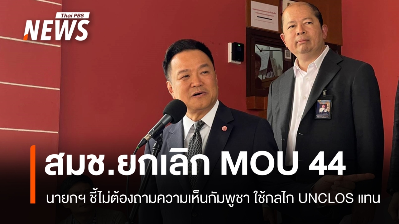 นายกฯ เผยมติ สมช.เห็นชอบยกเลิก MOU 44 ทันที ไม่ต้องถามความเห็นกัมพูชา เตรียมให้ กต.ทำเรื่องเสนอเข้า ครม. ใช้กลไก UNCLOS แทนวันนี้ (23 เม.ย.2569) นายอนุทิน ชาญวีรกูล นายกรัฐมนตรี และ รมว.มหาดไทย เปิดเผยว่า ที่ประชุมสภาความมั่นคงแห่งชาติ (สมช.) เห็นชอบยกเลิก MOU 2544 โดยจะใช้กลไกอนุสัญญาสหประชาชาติว่าด้วยกฎหมายทางทะเล (UNCLOS) แทน